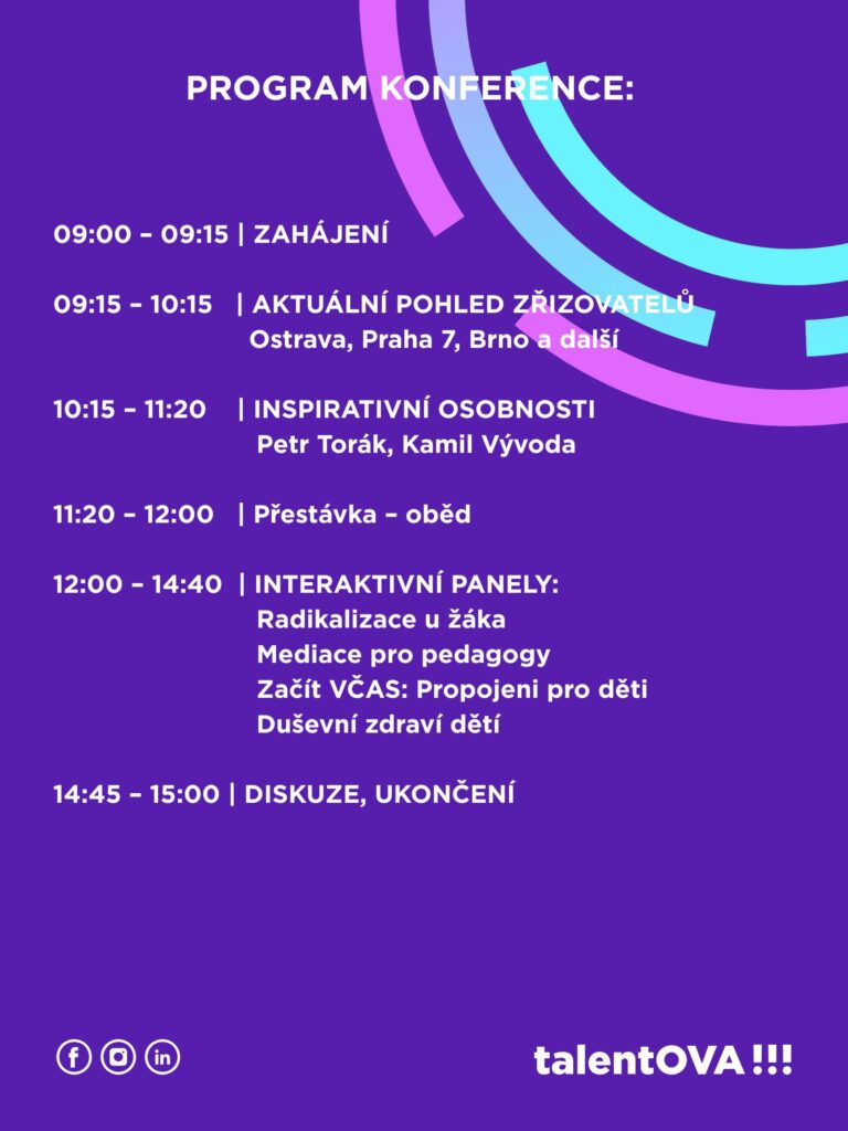 Zveme Vás na konferenci Desegregace ve vzdělávání: společně pro rovné příležitosti, která se bude konat 6. listopadu 2025 ve Středisku volného času Korunka na ul. Korunní v Ostravě v čase 09-15:00 hodin. Jedná se o konferenci věnovanou tématu rovného přístupu ke vzdělávání, propojení škol, zřizovatelů a odborníků. Cílem konference je otevřít prostor pro sdílení zkušeností, přístupů a dobré praxe v oblasti inkluzivního vzdělávání a desegregace ve vzdělávání.